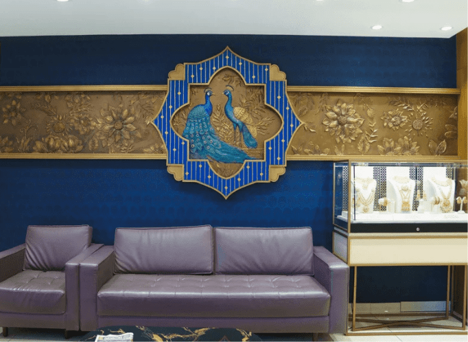 Athma Art Studio created a stunning wall art for Regal Jewellers, celebrating their heritage, craftsmanship, and legacy. The design blends traditional Kerala motifs, jewellery-inspired illustrations, and architectural elements to tell the brand’s story and milestones.