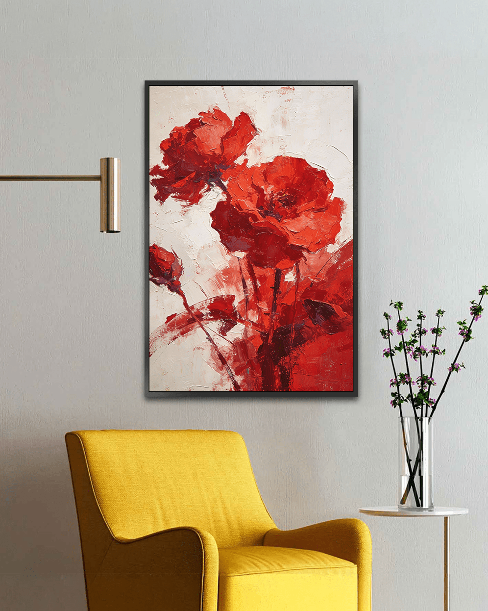 A vibrant modern floral artwork featuring expressive red roses painted in bold, textured brushstrokes—perfect for adding passion, energy, and elegance to contemporary interiors.
