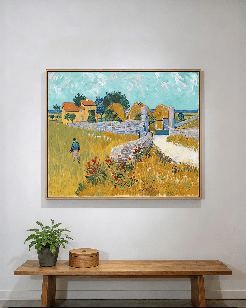 Farmhouse in Provence is a captivating landscape painted by Vincent van Gogh in 1888 during his time in southern France. The artwork portrays a tranquil countryside scene with a farmhouse, stone walls, open fields, and a lone figure walking through the land.