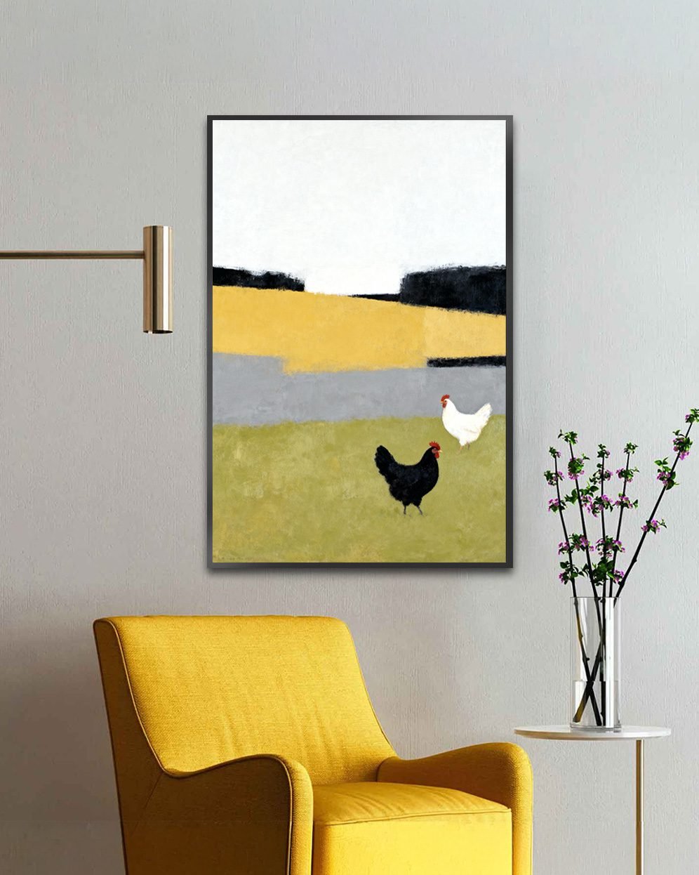 Add a touch of rustic charm and contemporary elegance to your space with Farmyard Harmony, a minimalist countryside artwork that blends simplicity with warmth. This painting features two hens—one black, one white—standing in an open field, painted with soft textures and muted tones. The background consists of layered blocks of yellow, grey, green, and dark accents, creating a modern abstract landscape that complements any interior style.