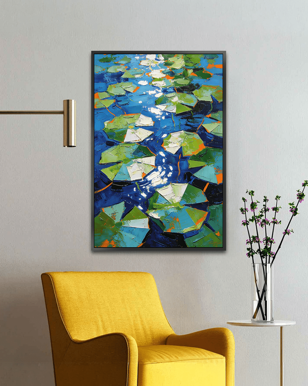 This contemporary abstract artwork captures the rhythm of flowing water and floating lily forms through expressive palette-knife strokes and layered acrylic textures. Deep blues represent moving water, while fragmented greens and soft whites resemble leaves and reflections dancing on the surface.