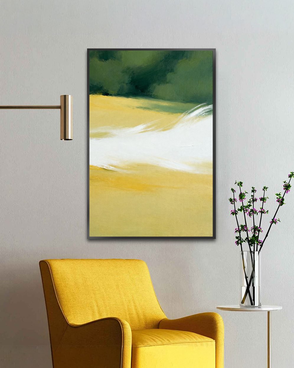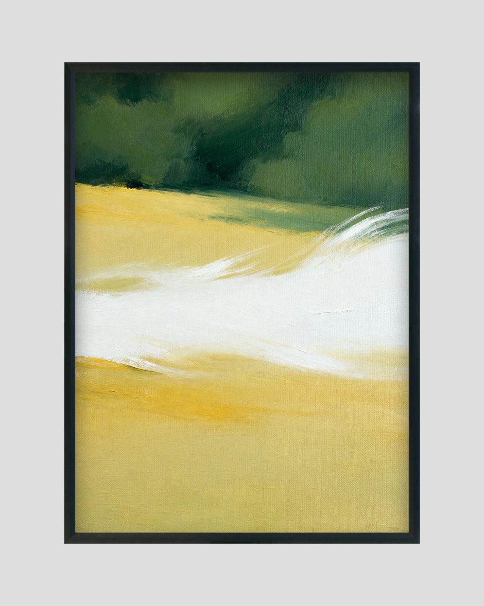 Bring calmness into your space with this soft minimalist landscape artwork featuring flowing white strokes over warm golden fields and deep green horizons.