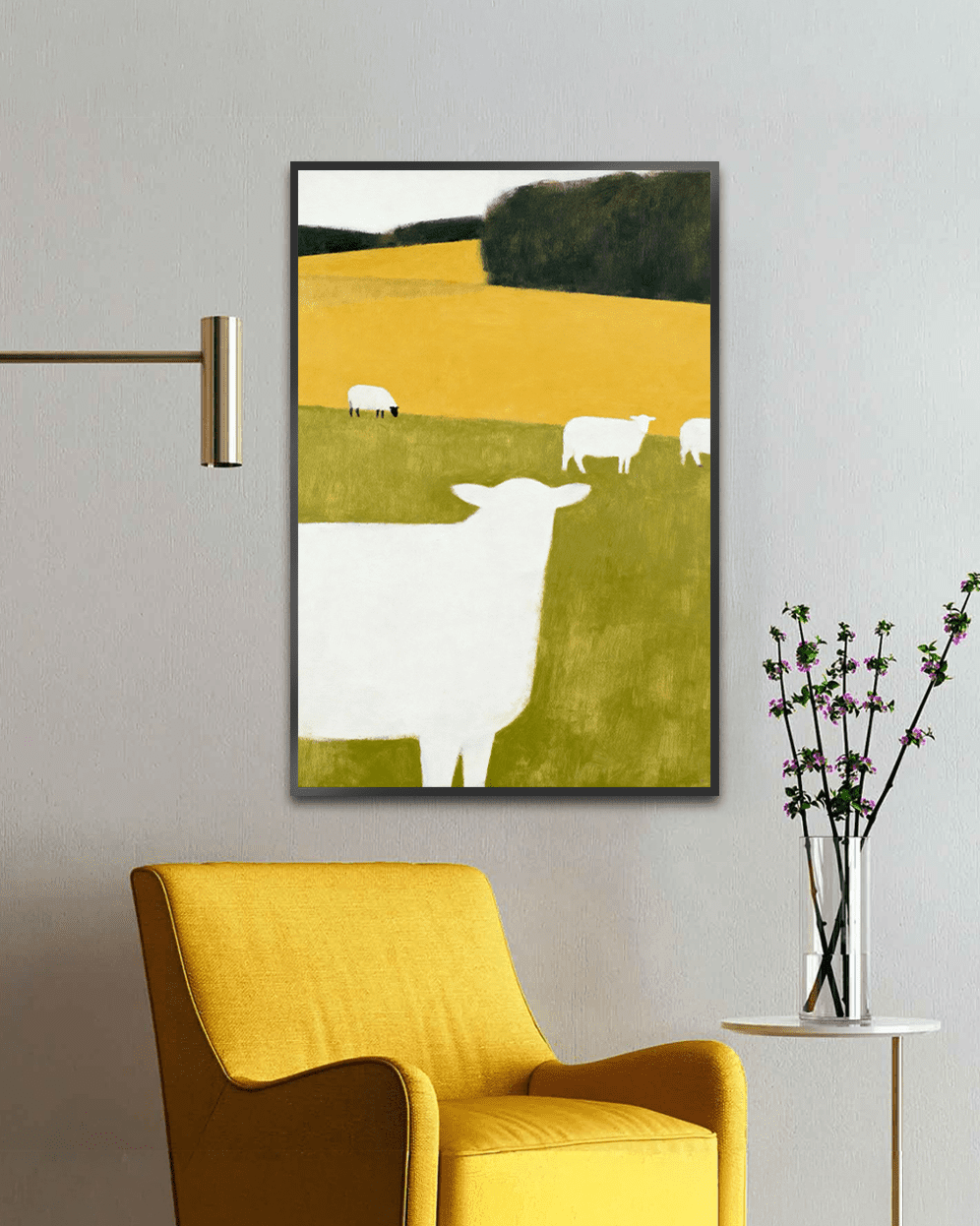 Bring calm countryside charm into your space with Golden Grazing, a minimalist sheep landscape artwork featuring white sheep grazing across warm yellow and green fields.
