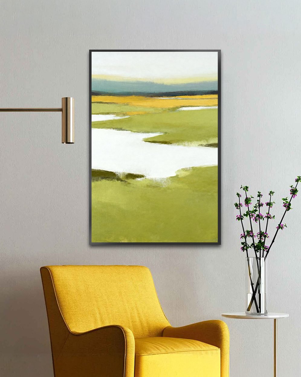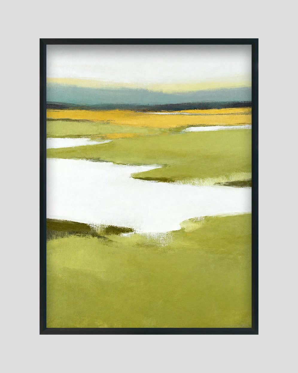 Introduce calm, warmth, and modern elegance to your space with Golden Meadows, a serene minimalist landscape artwork inspired by open countryside fields and winding water streams. The composition features gentle green meadows in the foreground, glowing golden tones in the distance, and smooth white waterways that guide the viewer’s eye across the canvas. With muted pastel tones and soft blending, this artwork brings a refreshing and peaceful atmosphere to any interior.