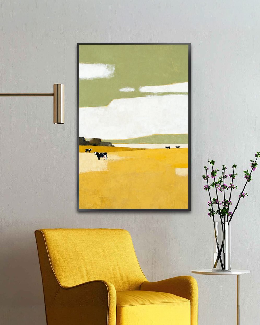 -Minimalist countryside landscape with grazing cows