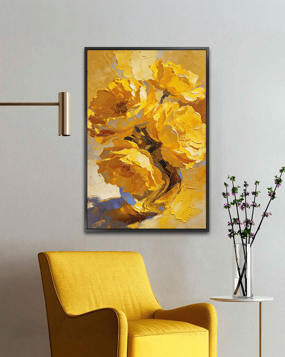 A vibrant contemporary floral artwork featuring radiant yellow blooms painted with rich palette knife textures—perfect for lighting up any modern interior.