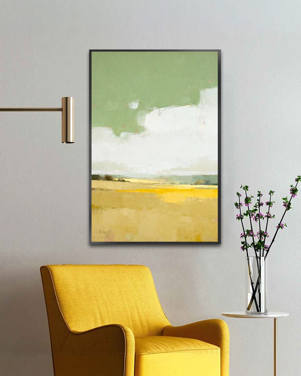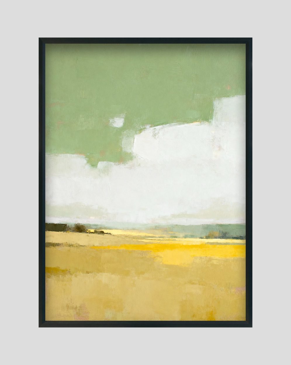 A soothing minimalist landscape painting featuring soft green skies, white clouds, and warm golden-yellow fields. Available in Acrylic on Canvas and Premium Printed Canvas with Black, White, or Wooden synthetic frames, in multiple sizes.