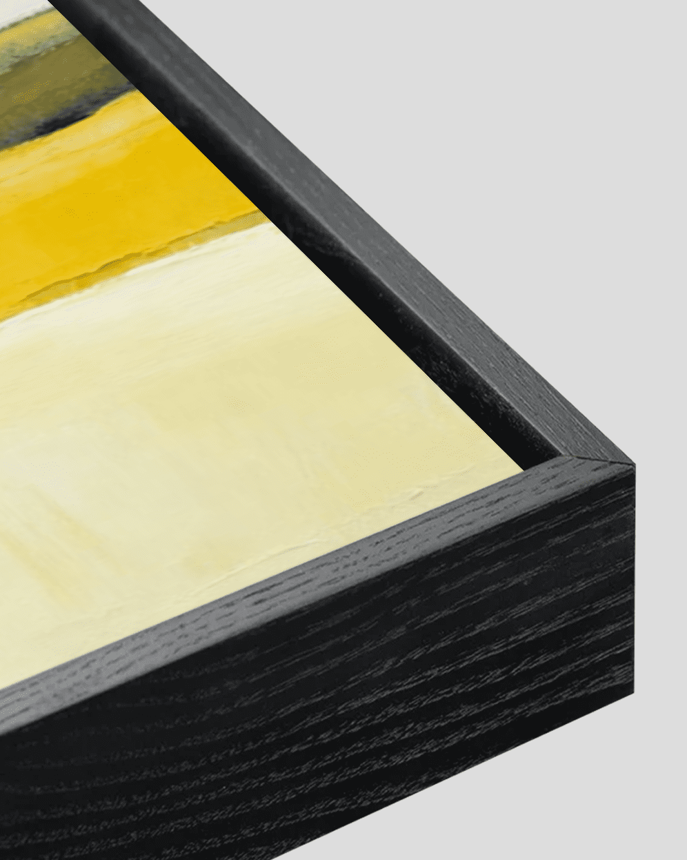 A soothing minimalist landscape painting featuring soft olive-green skies, warm yellow fields, and white abstract layers. Available in Acrylic on Canvas and Premium Printed Canvas with Black, White, or Wooden synthetic frames in multiple sizes.
