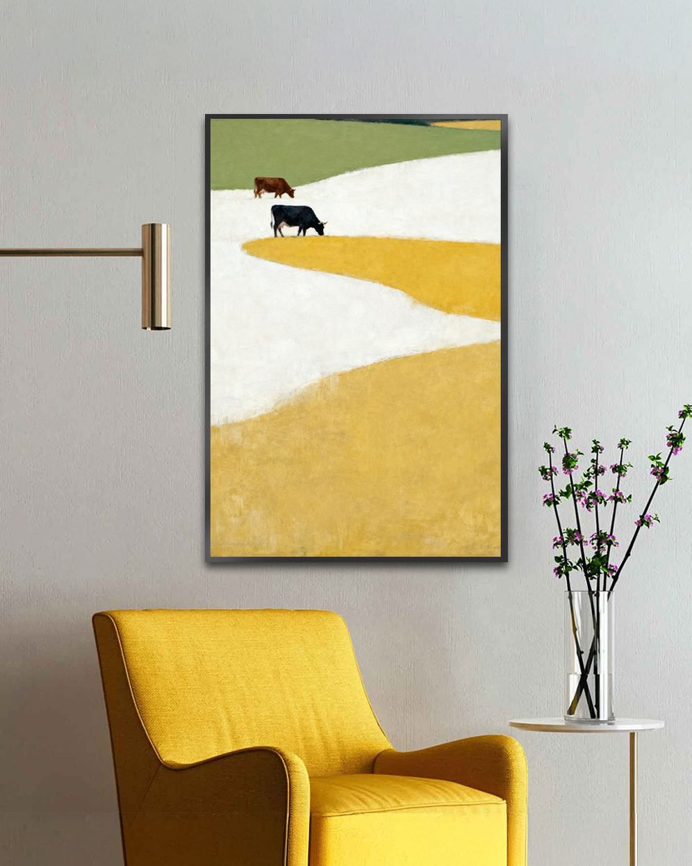 Bring the calm essence of open farmland into your home with Pasture Pathways, a modern minimalist landscape artwork. The painting features two cows grazing peacefully across gently layered fields—rich golden-yellow foregrounds, soft white pathways, and muted green horizons. The composition is simple yet visually striking, blending abstract forms with natural elements to create a scene that’s both soothing and contemporary.