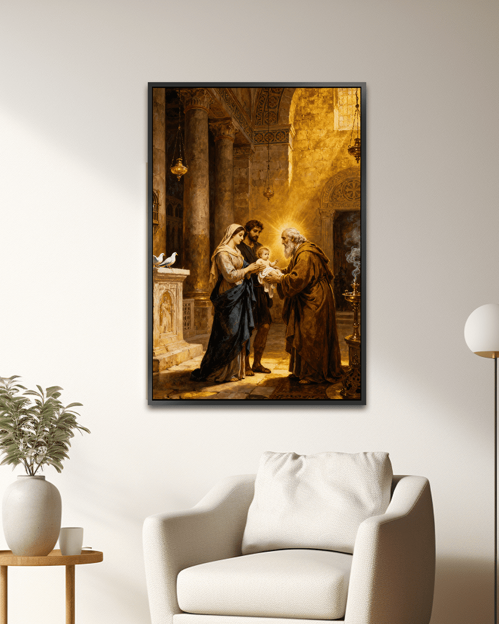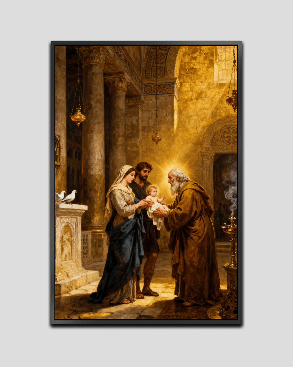 A sacred artwork depicting Mary and Joseph presenting the infant Jesus at the temple, where the elderly Simeon, guided by divine revelation, holds the child with deep reverence. Warm, gentle light symbolizes prophecy fulfilled and spiritual grace. Available in Acrylic on Canvas and Premium Printed Canvas with Black, White, or Wooden synthetic frames, offered in multiple sizes.