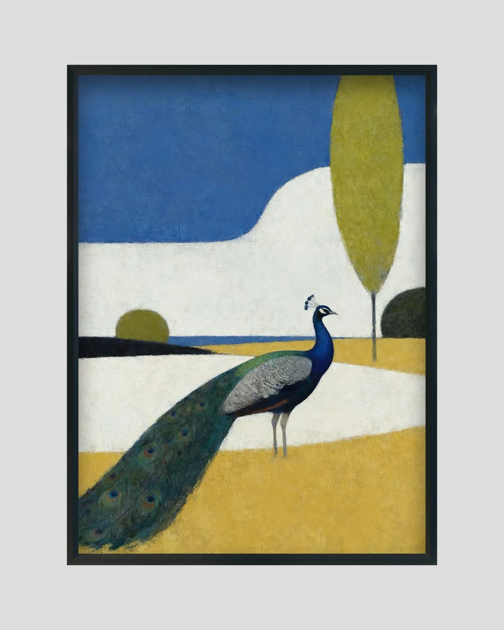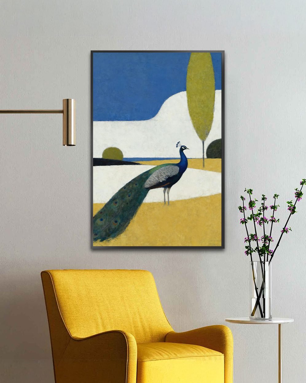 Add an elegant touch to your interiors with this modern minimalist peacock artwork featuring a graceful peacock standing against a serene landscape of rich blue sky, soft white hills, and warm golden fields.