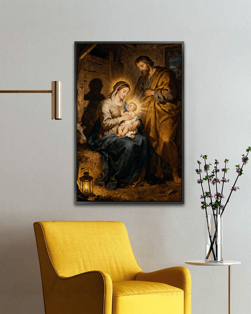 This peaceful artwork beautifully portrays the sacred moment of Christ’s birth. Mary gently cradles the radiant infant Jesus while Joseph stands watch with quiet reverence. The warm glow of lantern light fills the stable, highlighting the humble surroundings and the gentle presence of animals. Every detail reflects serenity, love, and divine holiness, making it a meaningful piece for Christmas décor or spiritual home interiors. Available in Acrylic on Canvas for rich texture and Premium Printed Canvas with Black, White, or Wooden synthetic frames, offered in various sizes to suit any space.