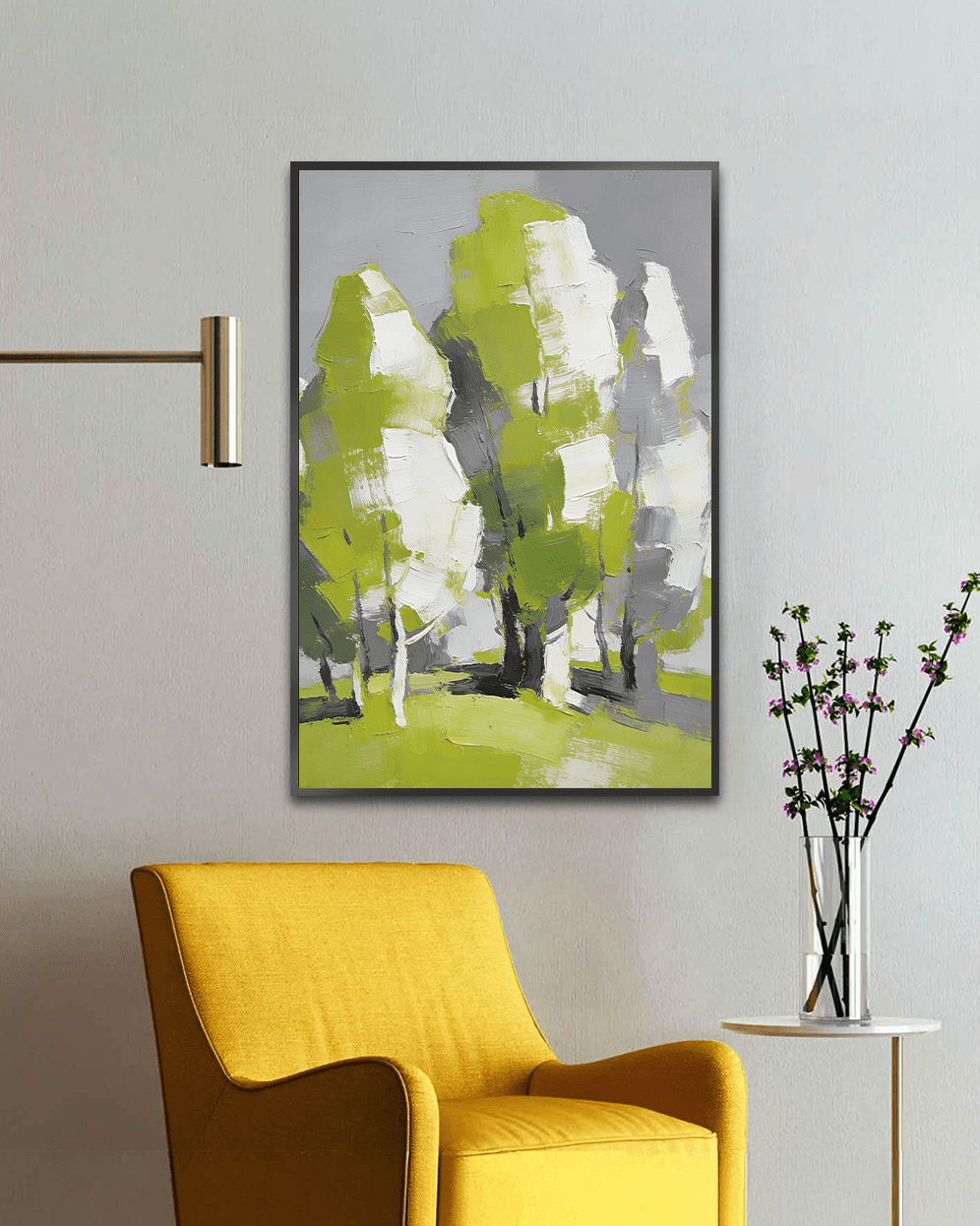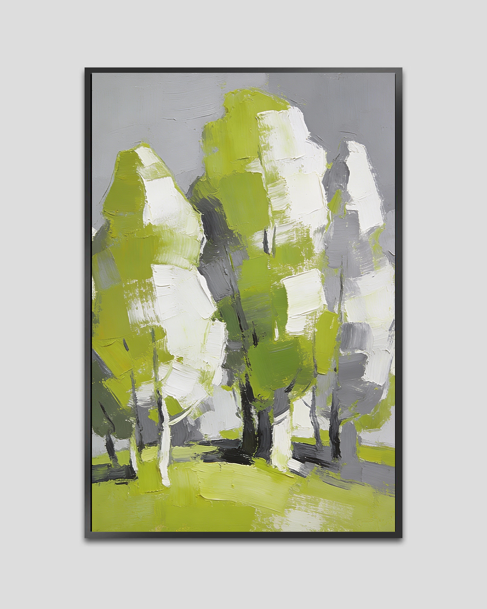 Silent Meadow is a peaceful abstract landscape inspired by open fields and softly standing trees. Subtle layers of green, grey, and off-white create a serene atmosphere, while expressive brushstrokes bring organic movement and depth.