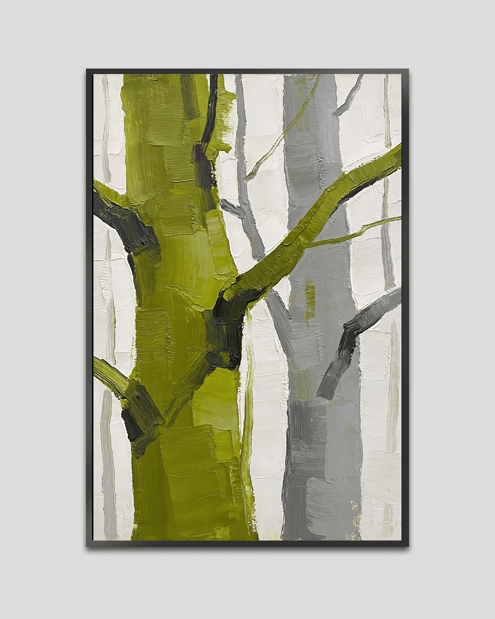 Still Roots is a contemporary abstract painting that captures the silent strength of trees through textured brushstrokes and organic form. Deep moss greens blend with muted greys and soft whites, creating a grounded and calming visual experience.