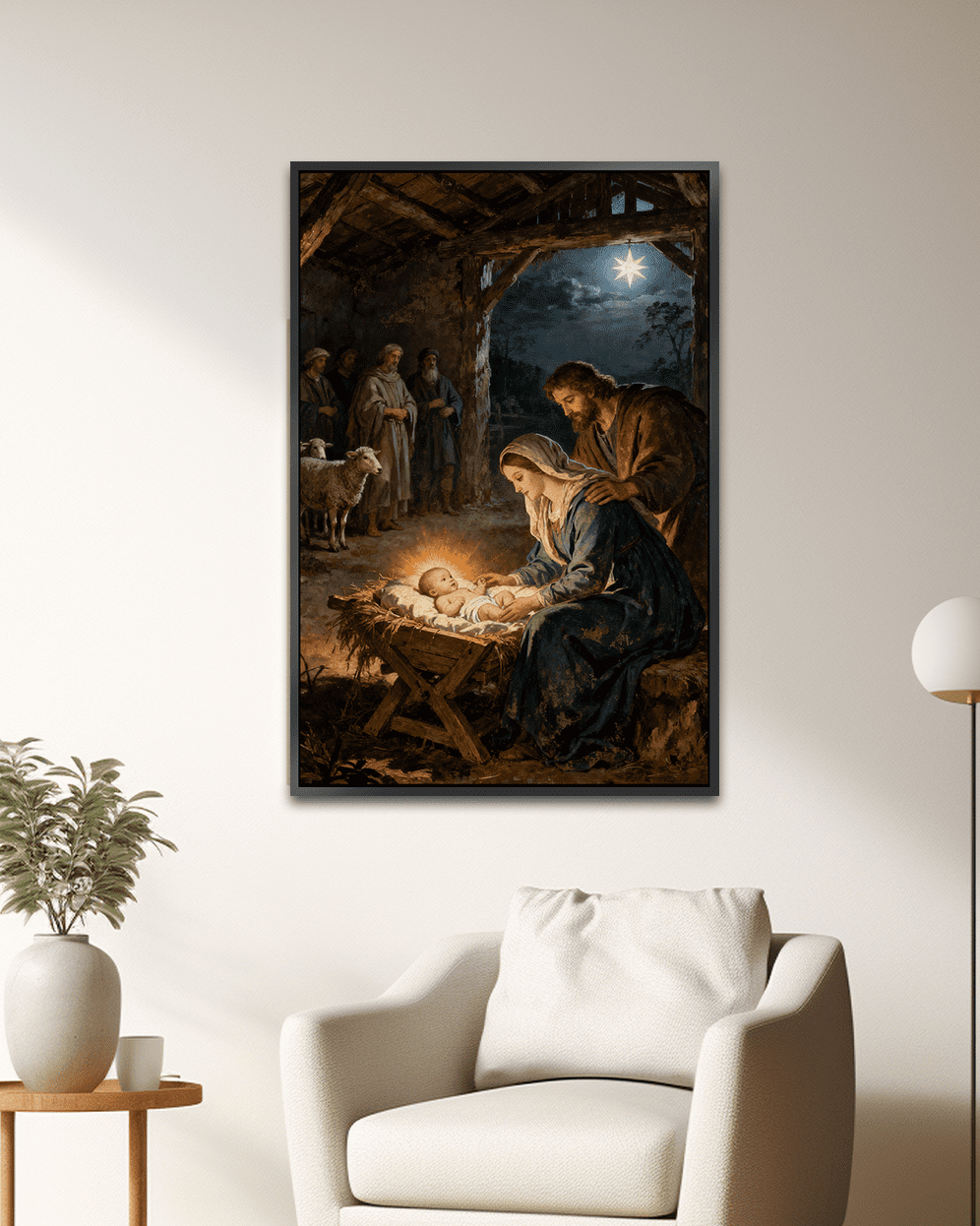 A serene Nativity artwork depicting Mary and Joseph gazing lovingly at the radiant infant Jesus in the manger, as shepherds look on in reverence under the guiding Star of Bethlehem. The warm glow and peaceful setting beautifully capture the holiness of Christ’s birth. This beautiful painting is available in Acrylic on Canvas and Premium Printed Canvas with synthetic frame options in Black, White, or Wooden, offered in multiple sizes.