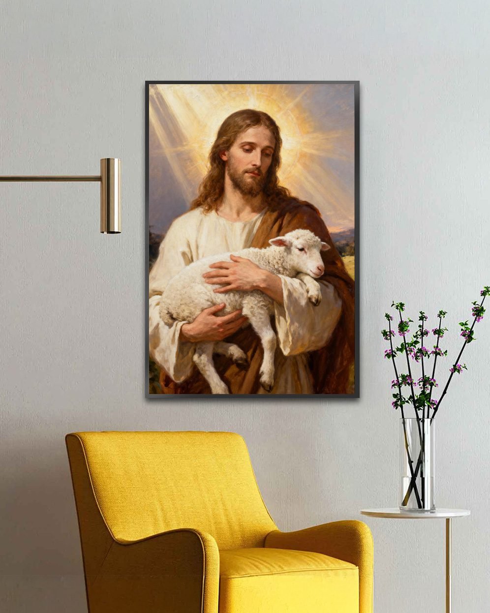 A serene and divine artwork featuring Jesus gently holding a lamb, symbolizing love, protection, and peace. Available in Acrylic on Canvas and Premium Printed Canvas with Black, White, or Wooden synthetic frames, in multiple sizes.