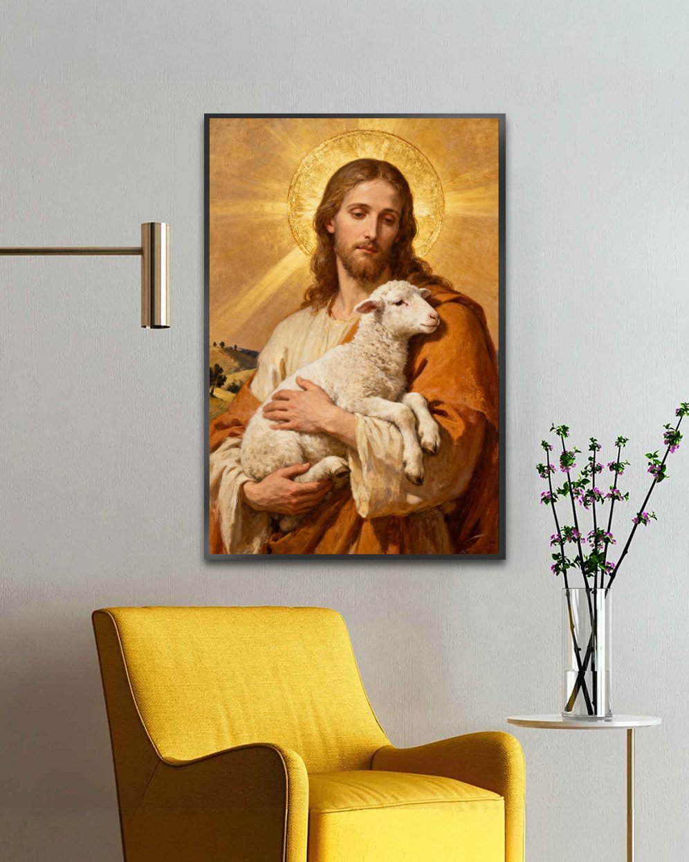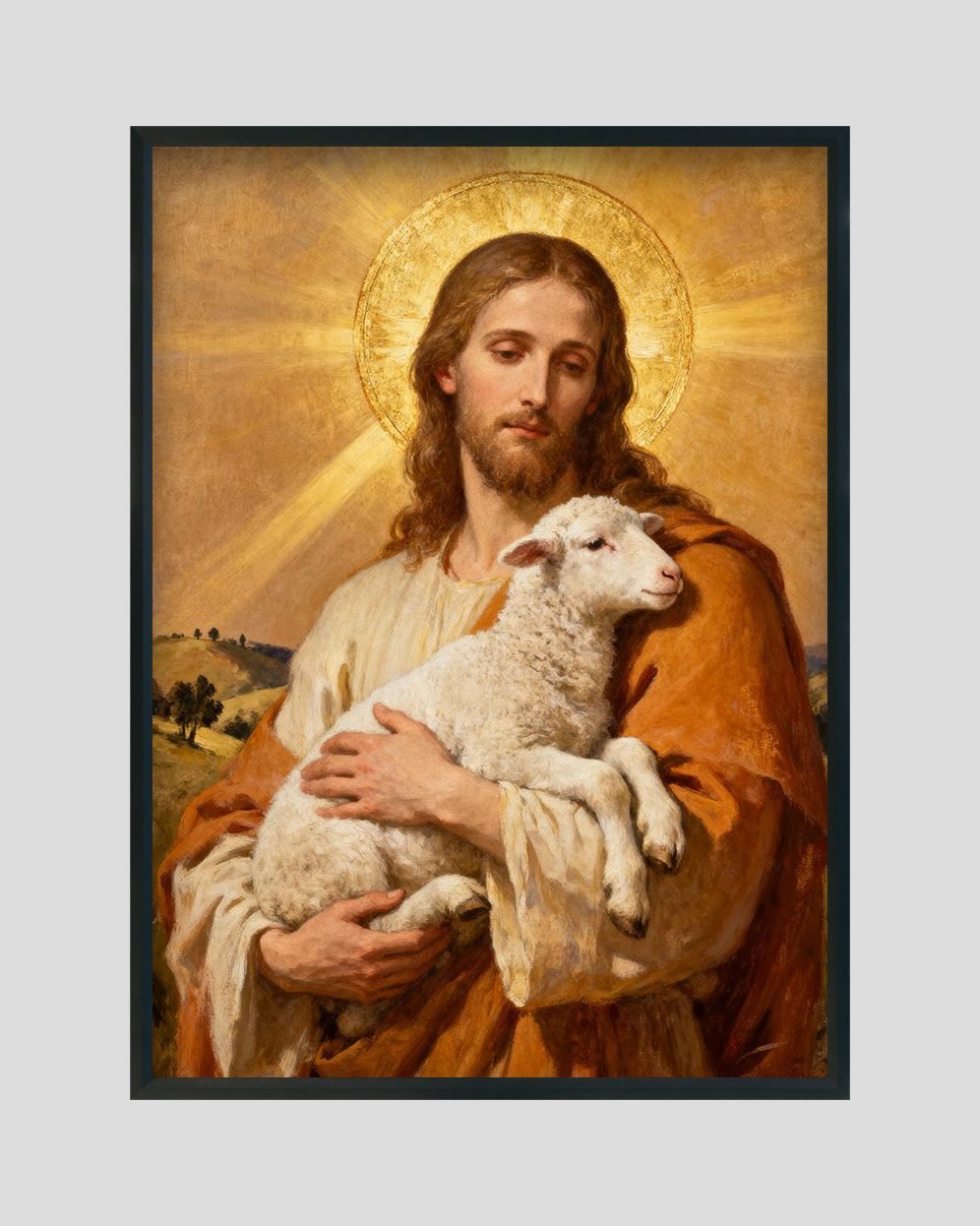 A serene and heartwarming artwork of Jesus as the Good Shepherd, lovingly holding a lamb with a radiant golden halo behind Him. This timeless Christian painting brings peace, comfort, and divine presence to any space.
