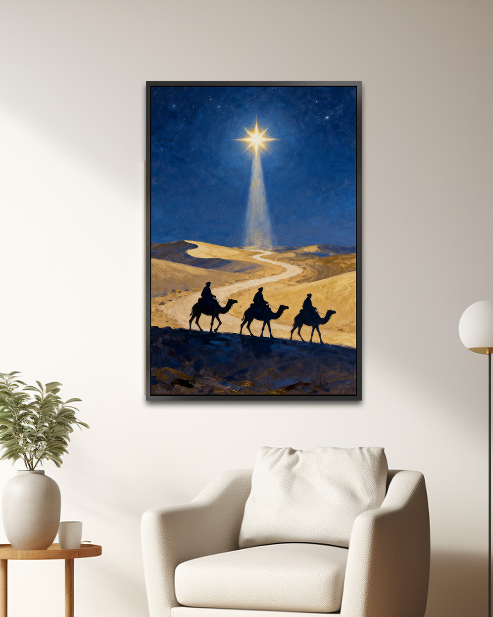 A majestic artwork depicting the Three Wise Men traveling across golden desert dunes, guided by the radiant Star of Bethlehem. The glowing night sky and winding path evoke a powerful sense of wonder, hope, and divine direction. Available in Acrylic on Canvas and Premium Printed Canvas with Black, White, or Wooden synthetic frames, offered in multiple sizes.